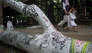Some days back New Delhi banned screening of “In the Shades of Fallen Chinar” a documentary on Kashmir at the 10th edition of the International Documentary and Short Film Festival of Kerala.  It is a beautifully made film by two young filmmakers   Fazil NC and Shawn Sebastian from Kerala that looks at the Kashmir tragedy through the eyes of young artists in Kashmir University, who had brought to life a fallen Chinar tree in the Naseem Bagh campus through their brush and paint.  Fifteen students from Music and Fine Arts department like all children born and brought up  during the past two and half decades of curfews, gruesome killings, custodial deaths,  enforced disappearance and mass rapes  bursting with angst used a fifty feet long trunk of the fallen Chinar tree as a medium to express their pent-up urge for freedom. Through their labor of love, they made it sing the saddest songs of their land. The muse in the log could catch the imagination of even commonest of commoners and not say about creative filmmakers- it had captured the imagination of two creative filmmakers from South India, who immortalized this piece of ‘resistance-art’ by capturing it on celluloid.